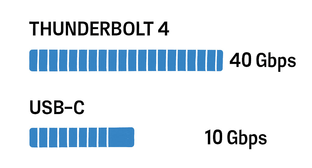 Data transfer speed is a big factor when picking between Thunderbolt 4 and USB-C. Thunderbolt 4 consistently supports up to 40 Gbps. This makes it ideal for high-demand scenarios.