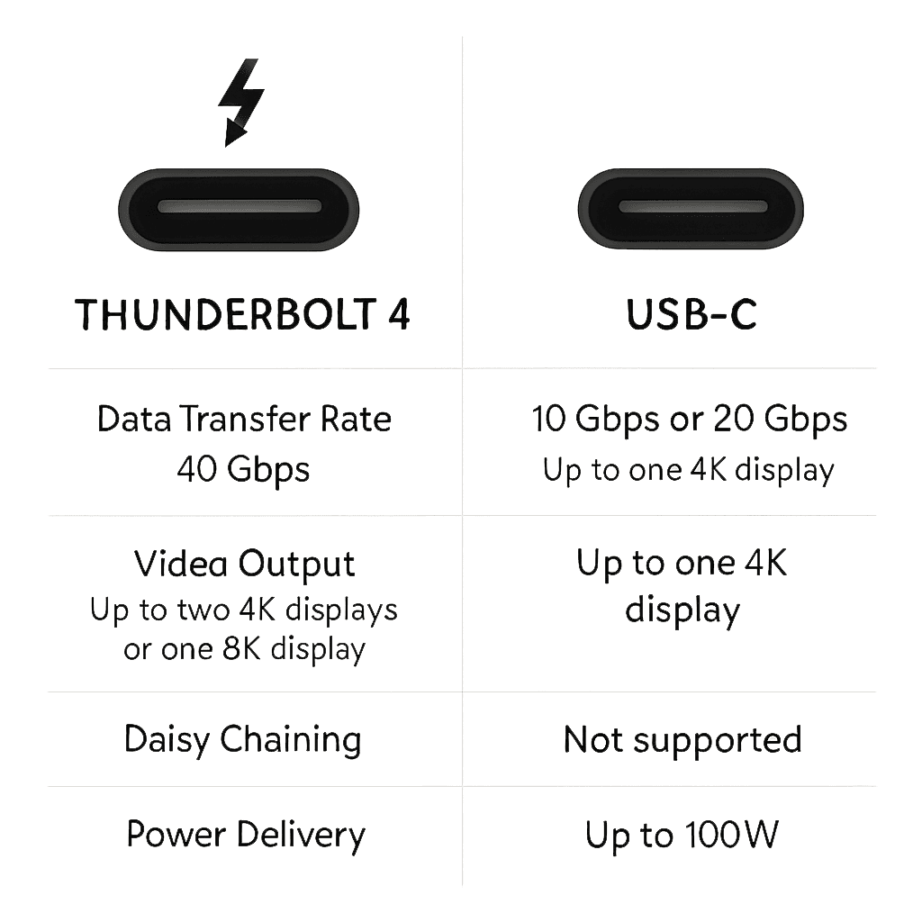 Choosing between Thunderbolt 4 and USB-C depends on your specific needs. Thunderbolt 4 is perfect for those who need fast data transfers and advanced display options.